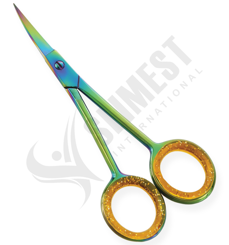 Available Sizes. 4.5 in Details. All scissors are made of superior quality stainless steel 410, HRC° (hardness) 45° – 48°. Available in Blister Packing, Pouches and Plastic Bags. Dissecting Scissors Blue Titanium coated, Adjustable. Screw, Curved