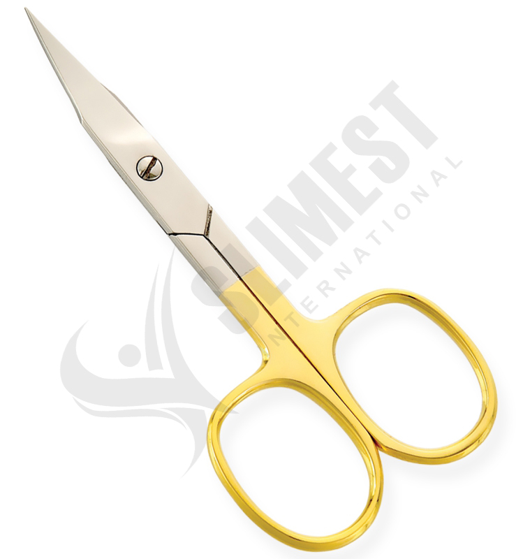 Available Sizes. 3.5 in Details. All scissors are made of superior quality stainless steel 410, HRC° (hardness) 45° – 48°. Available in Blister Packing, Pouches and Plastic Bags. Cuticle Scissors Gold Platted, Adjustable Screw, Curved