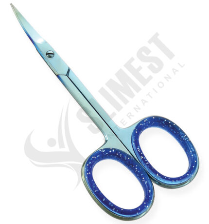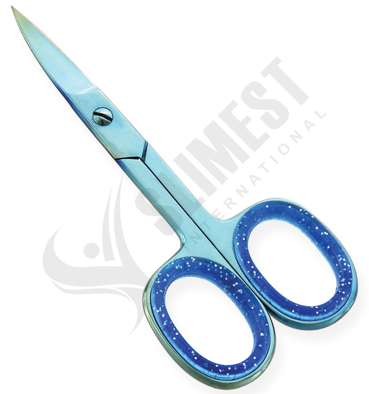 Available Sizes. 3.5 in Details. All scissors are made of superior quality stainless steel 410, HRC° (hardness) 45° – 48°. Available in Blister Packing, Pouches and Plastic Bags. Cuticle Scissors Blue Titanium coated, Adjustable. Screw, Curved