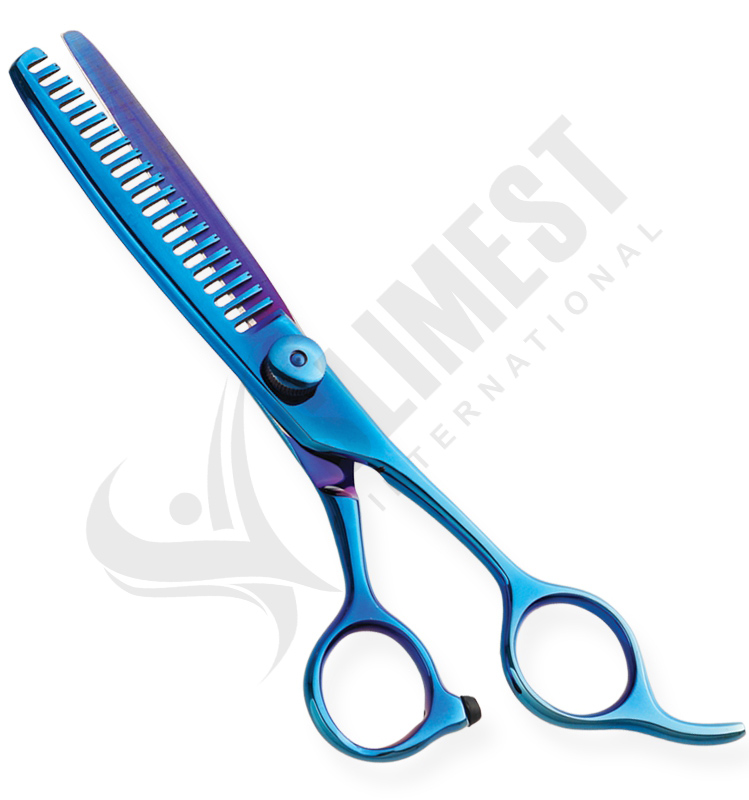 Professional Razor Edge Blue Titanium Coated Thinning Scissor, Movable Screw with Fixed Finger Rest. Available Sizes. 4 in, 4.5 in Details. Razor Edge thinning scissors made of Japanese stainless steel J/2 – 420, HRC° (hardness) 52° – 55°. Also available in 440C HRC° (hardness) 60° – 65°. Available in fix, limitation, adjustable and hand adjustable screws with and without leaf spring.