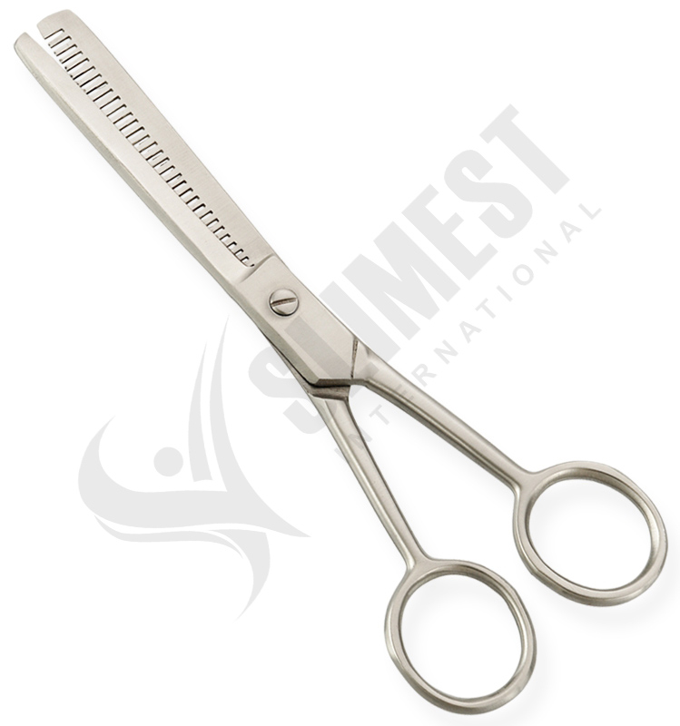 Thinning Scissors. Available Sizes. 4 in, 4.5 in Details. Standard thinning scissors are made of superior quality stainless steel 410, HRC° (hardness) 52° – 55°. Available in fix, limitation, adjustable and hand adjustable screws with and without leaf spring.