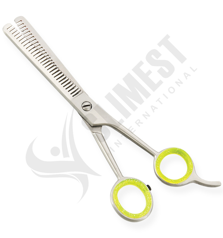 Thinning Scissors. Available Sizes. 4 in, 4.5 in Details. Standard thinning scissors are made of superior quality stainless steel 410, HRC° (hardness) 52° – 55°. Available in fix, limitation, adjustable and hand adjustable screws with and without leaf spring.