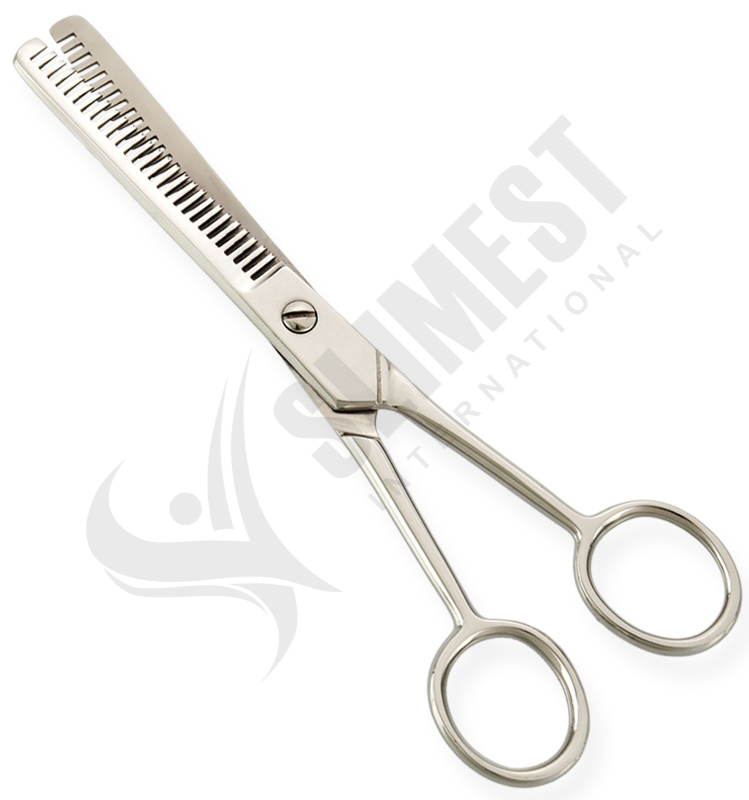 Thinning Scissors. Available Sizes. 4 in, 4.5 in Details. Standard thinning scissors are made of superior quality stainless steel 410, HRC° (hardness) 52° – 55°. Available in fix, limitation, adjustable and hand adjustable screws with and without leaf spring.